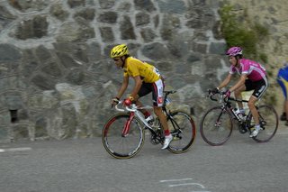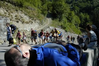 So we got to the base of Alpe d'Huez about 10pm to thousands of people partying. It was crazy. We drove up the hill a ways and with the number of cars, bikes and pedestrians on the road, decided we wouldn't get a spot at the finish and drove back down and parked at the bottom. Threw all the sleeping gear into the backpacks and started hiking up. Got about 4km up and camped around midnight. So the next day we wake up expecting the roads to quiet down as they start getting ready for the stage. But thousands of cars, bikes and pedestrians continue to stream up the hill in front of us. 11am, 12am, 1pm, still no signs of closure or the start. By this time it was easily 100°F and we were dieing of starvation and dehydration. We had 9 euros to our name and only about 9 crappy rice krispy bars we were given at the internet cafe the day prior. I finally was able to walk down to a restaurant and grab some baguettes and ham for the last of our money.